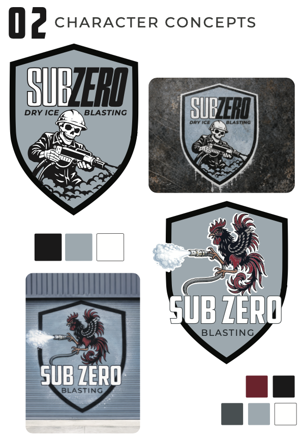 The logo direction was inspired by the Sprite logo and the Roosters NFL team. I explored a range of character-based concepts that leaned into the “sub zero” idea; strong, bold and a bit playful. While those weren’t the final direction, they helped shape the overall feel of the brand.